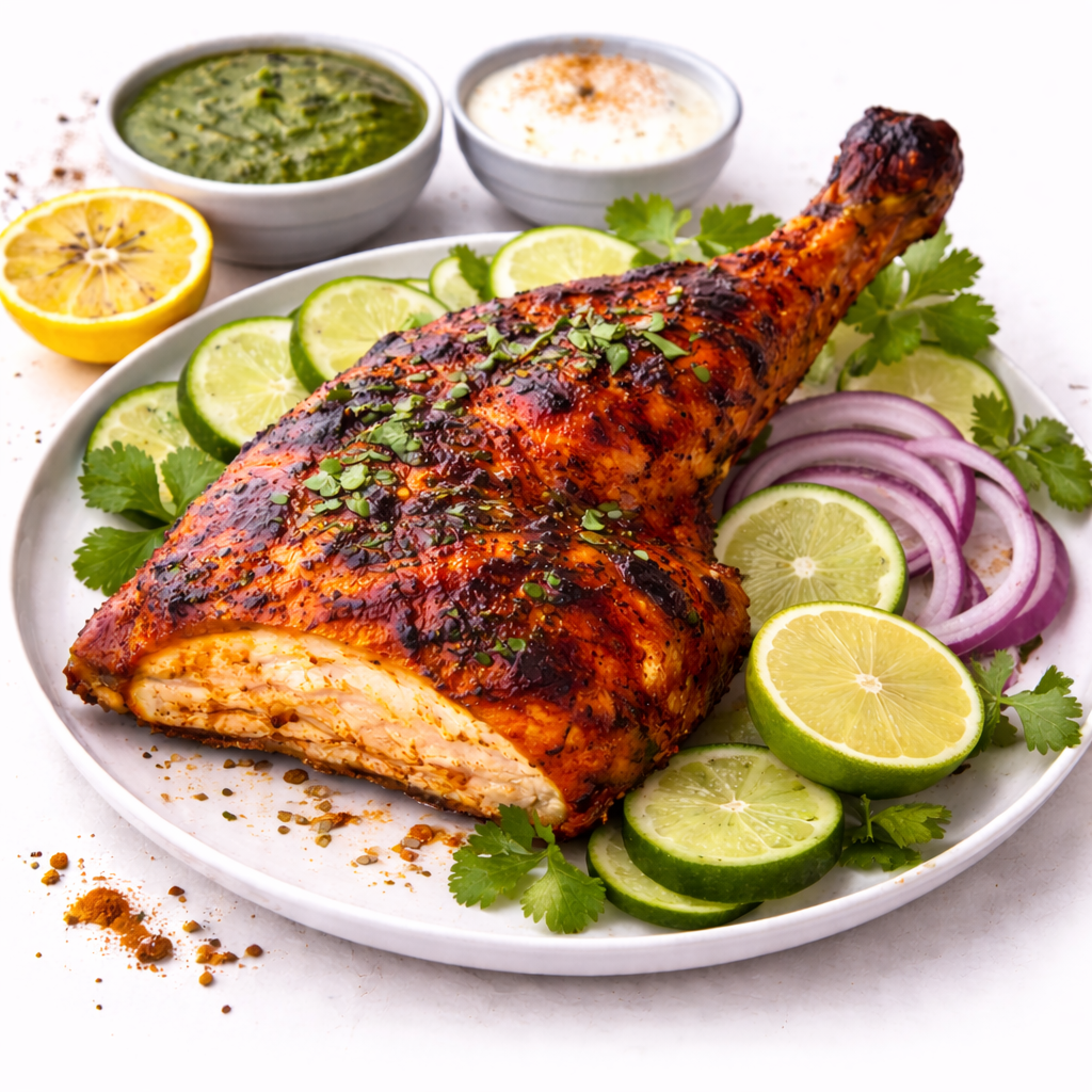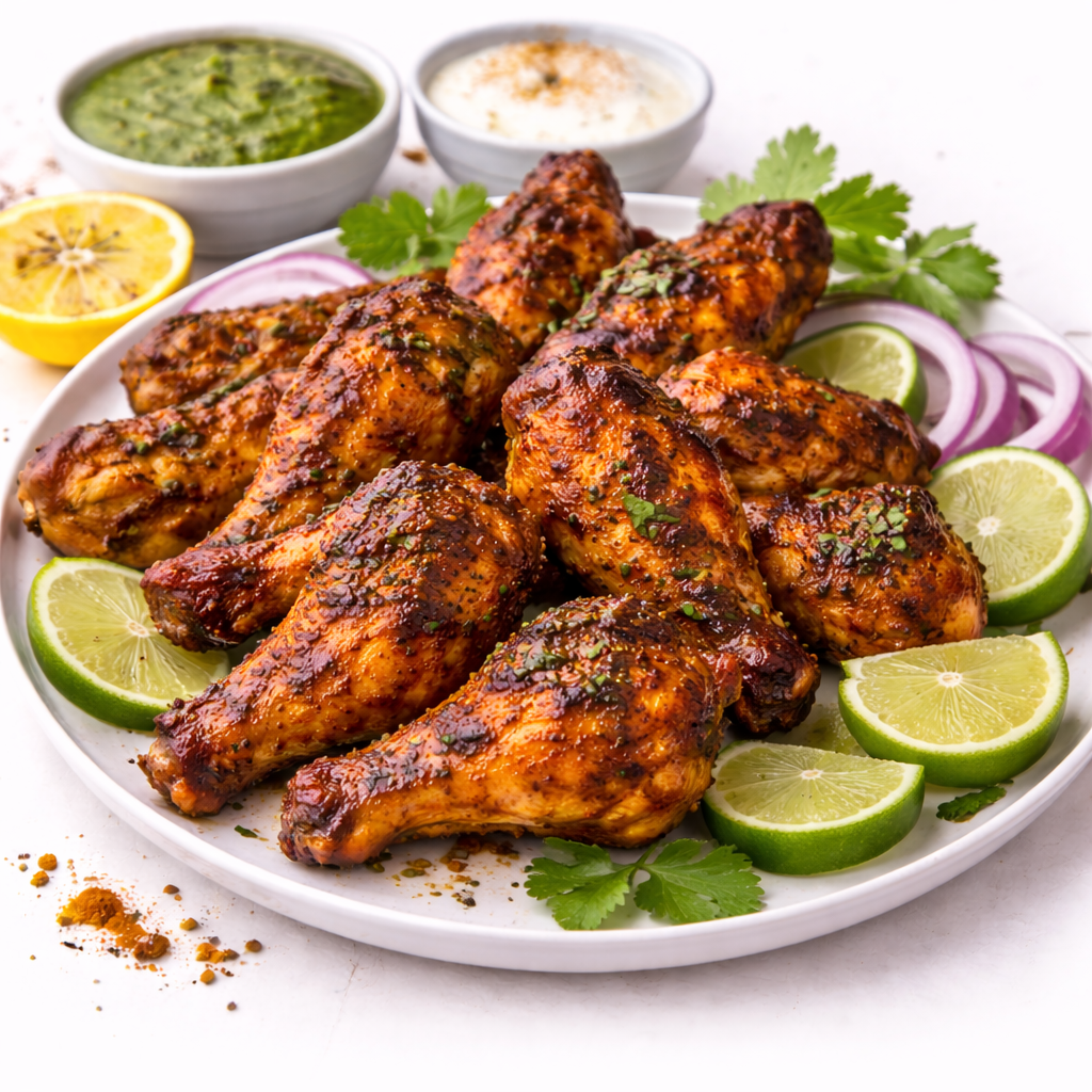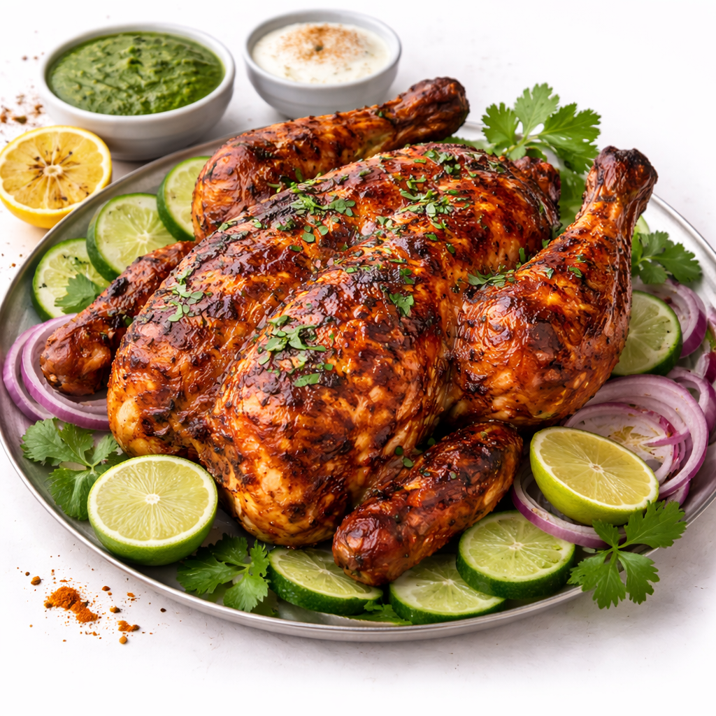 Tandoori grillezett csirke hagymamártás, paradicsomszósz, zöld chili, burgonya