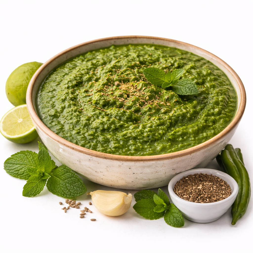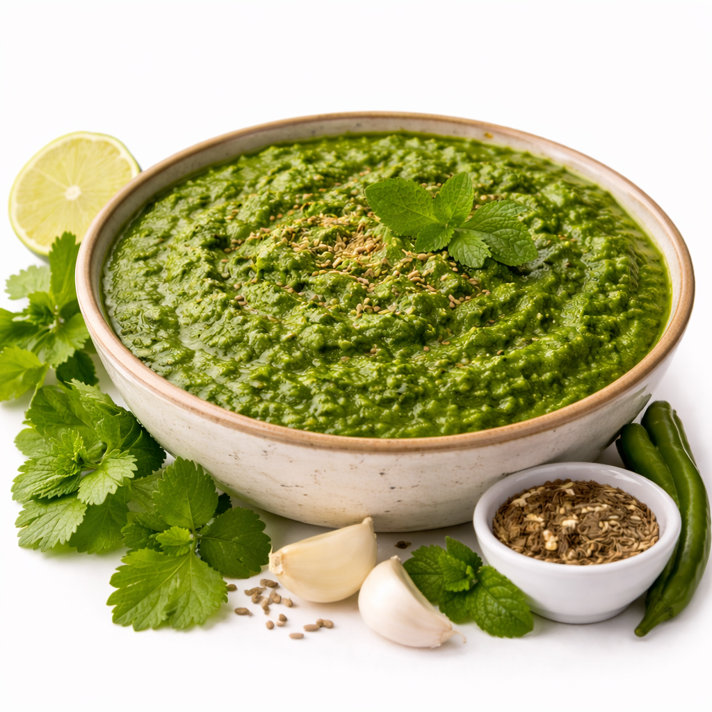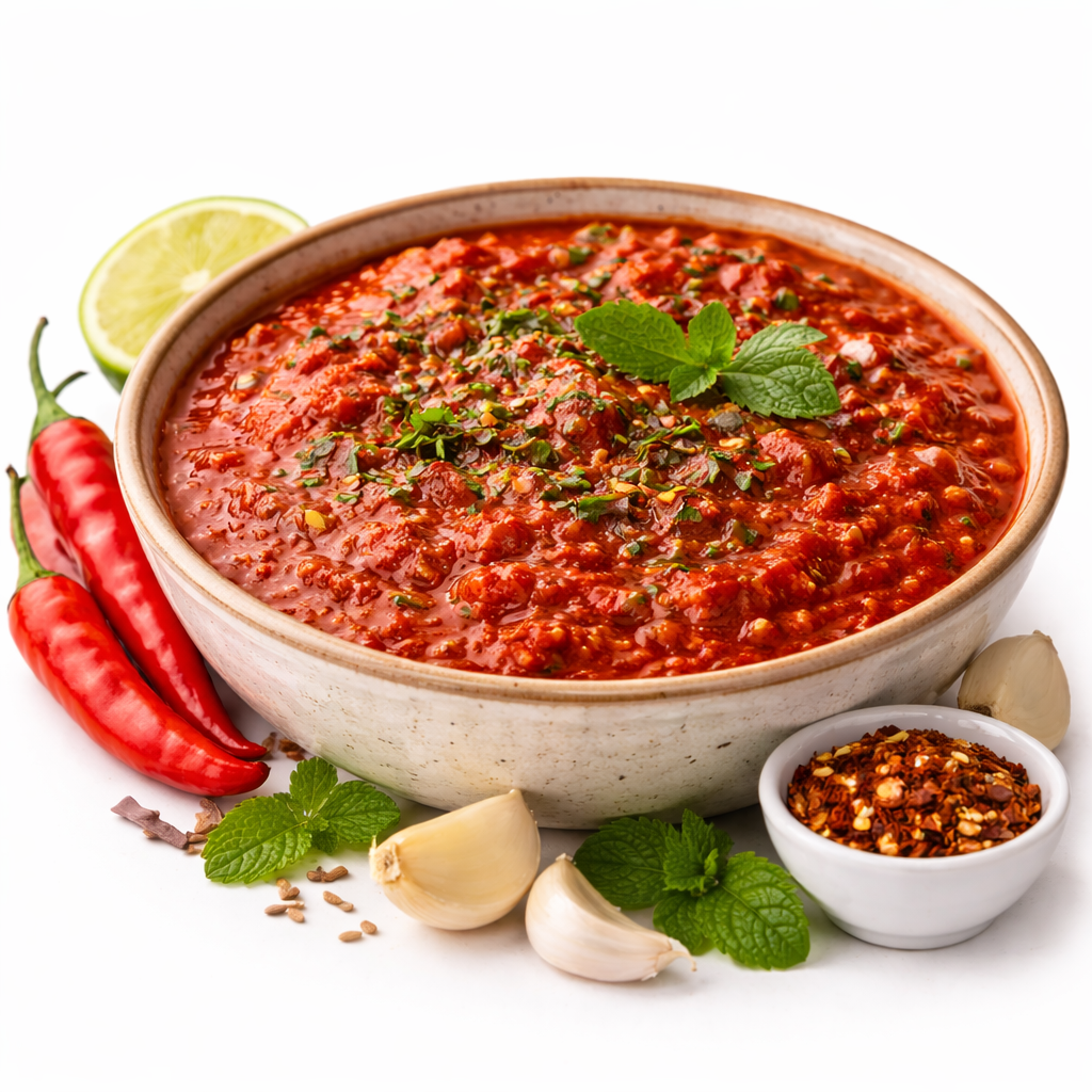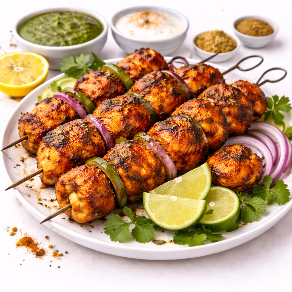 Tandoori grillezett csirke hagymamártás, paradicsomszósz, zöld chili, burgonya